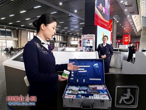 “向阳花”团队工作人员介绍应急药箱服务。 中国经济网记者 魏金金 摄