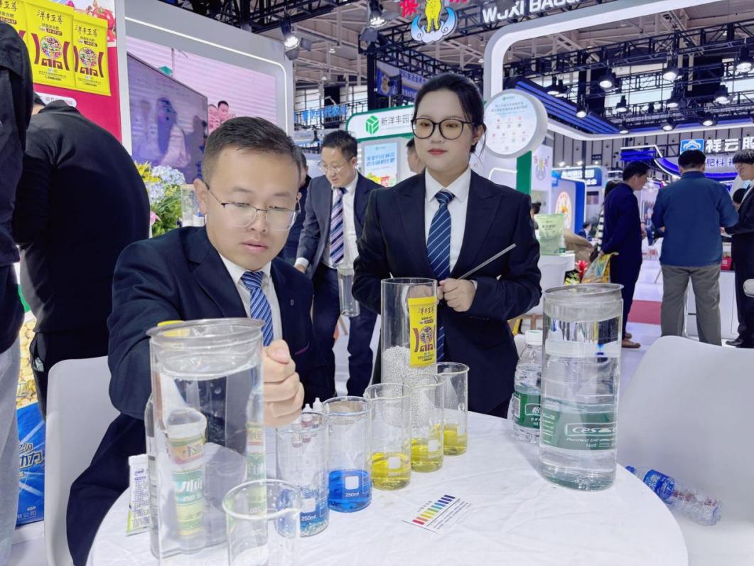 现场设置的产品互动试验区更是成为全场焦点。在溶解实验中,生物有机肥“洋丰豆”全水溶精华版遇水即溶、迅速崩解,展现出了优异的滴灌、喷灌适用性;而在酸碱中和试验中,升级硫基复合肥“洋丰至尊”通过明显的颜色变化,直观展现了其调节土壤酸碱度的独特功效。