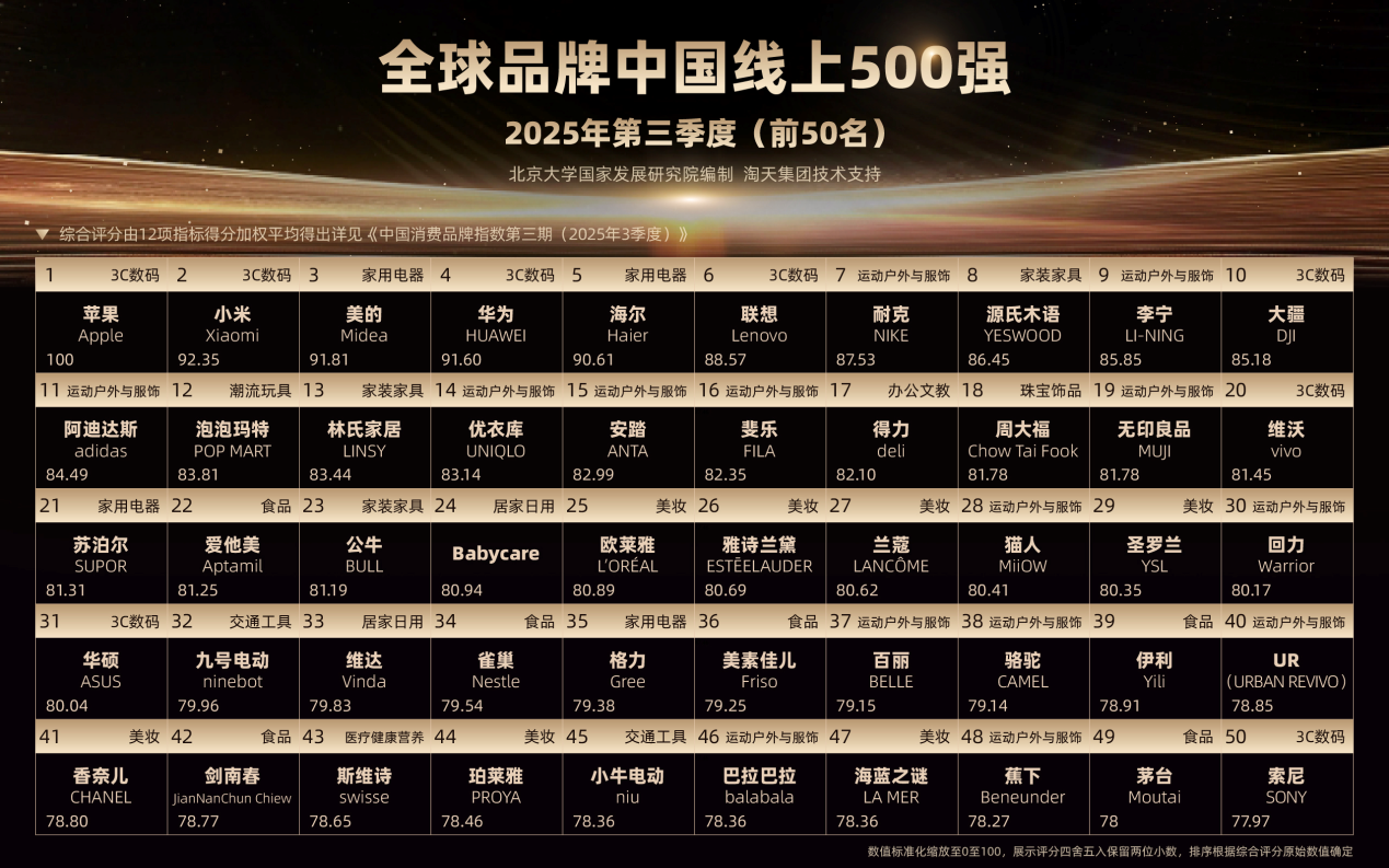 本次研究基于2025年7月至9月淘宝天猫平台的真实消费大数据展开,结果显示,全国线上消费品牌指数(CBI)为62.65,同比增长0.92%,意味着线上消费者对于品牌商品的偏好继续上升。具体品牌评分排名方面,凭借在成交额、搜索、好评等维度的优异表现,大疆、泡泡玛特等国产原创品牌增长迅速,大疆首次跻身“全球品牌中国线上500强榜单”前10,泡泡玛特名列第12位。