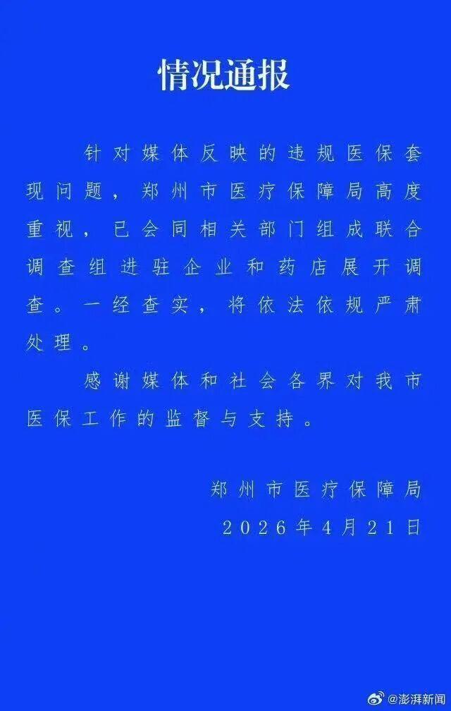 此前,中国新闻网“民生调查局”4月21日报道,记者在湖南、河南等地随机走访了30多家连锁药店,发现其中10余家存在违规套取医保基金的行为,涉及养天和大药房、老百姓大药房、老百姓怀仁药房、益民大药房等多家知名连锁药店。