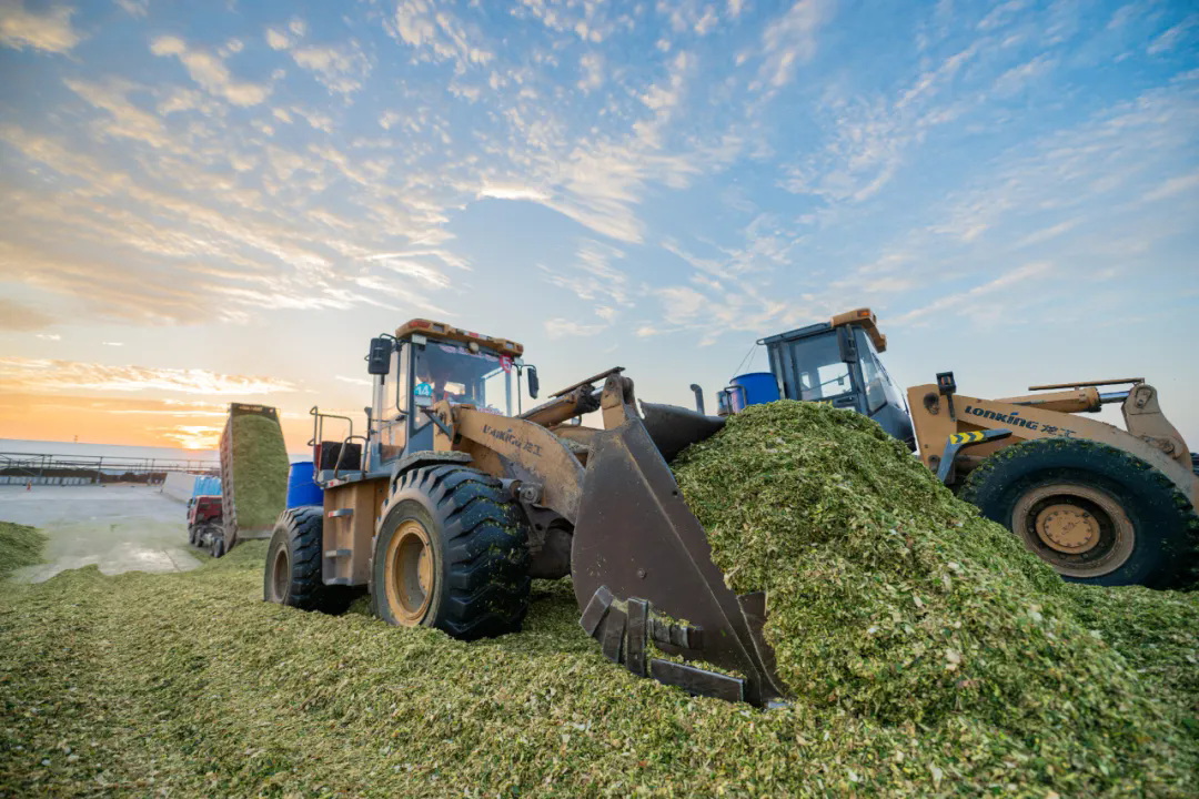 秋分前后是制作青贮的黄金期,现代牧业乌兰布和一牧收割的全株玉米,淀粉含量达33%、水分控制在67%。田野间,收割机呈“品”字形推进,切割、粉碎一气呵成,蜡熟期的玉米连同植株被切割成2公分左右的饲草颗粒,通过传送带涌入随行的运输卡车。