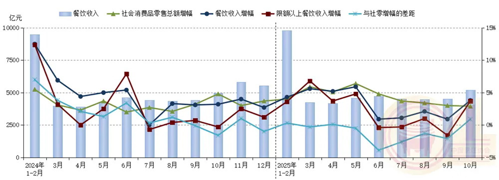中国烹饪协会分析,10月份,餐饮收入增速、限额以上单位餐饮收入增速同比上涨0.6个、4.0百分点,餐饮收入增速领先于社会消费品零售总额增速0.9个百分点。全国餐饮收入占社会消费品零售总额的比重为11.2%,环比上涨0.5个百分点,显示出餐饮消费在扩大内需中的重要支撑作用。