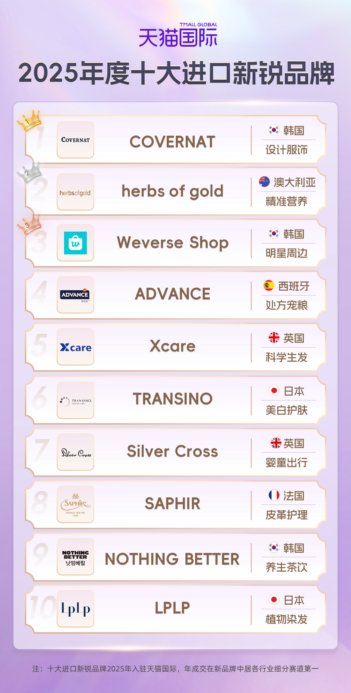 1月27日,天猫国际发布“2025年度十大进口新锐品牌”榜单。韩国服饰品牌COVERNAT,澳大利亚营养品牌herbs of gold,韩国明星周边品牌Weverse Shop位列进口新品牌成交前三名,成为进口“尖子生”代表。
