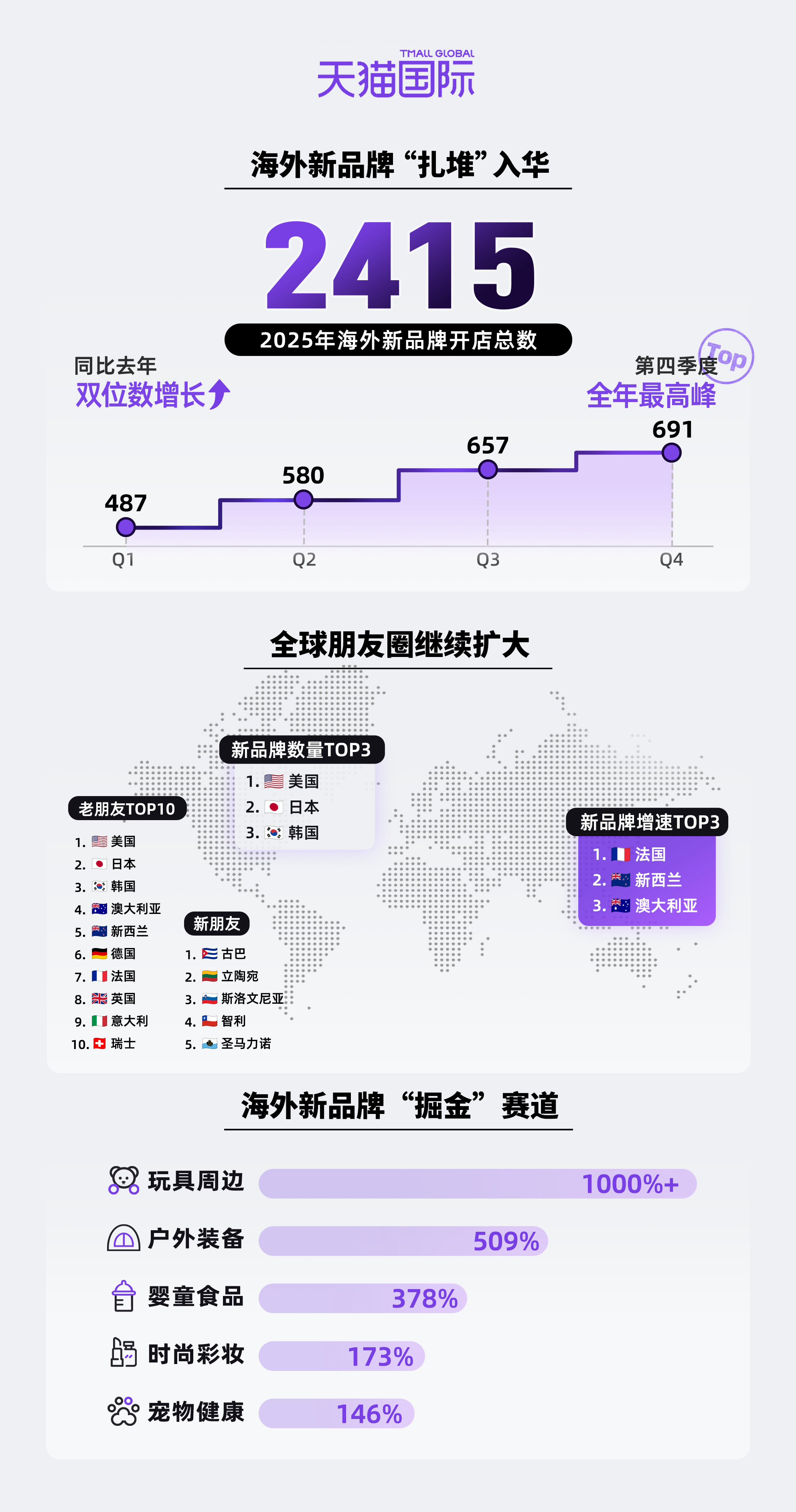 中国市场仍是全球品牌增长的“必争之地”。天猫国际数据显示,2025年有2415个海外新品牌在天猫国际开出首店,首店数量双位数增长。这意味着,平均每天有超过6家海外新品牌在天猫国际正式“开门营业”。第四季度入驻势头最猛,691家新品牌入驻,创下全年峰值。