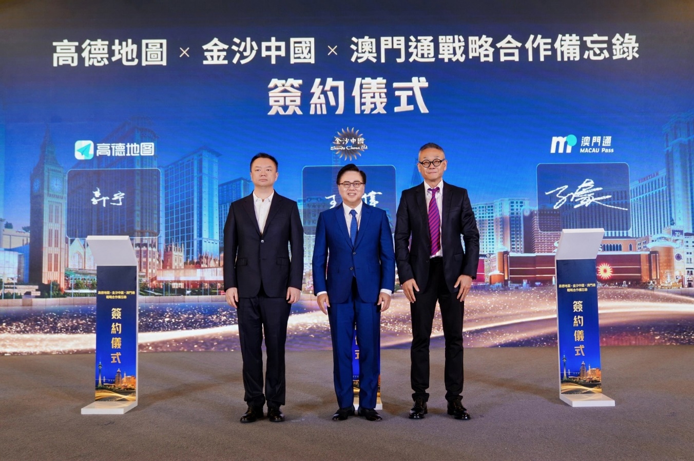 高德地图首席执行官郭宁、金沙中国有限公司行政副主席王英伟博士及澳门通董事会主席兼总经理孙豪三方战略合作备忘录签约仪式