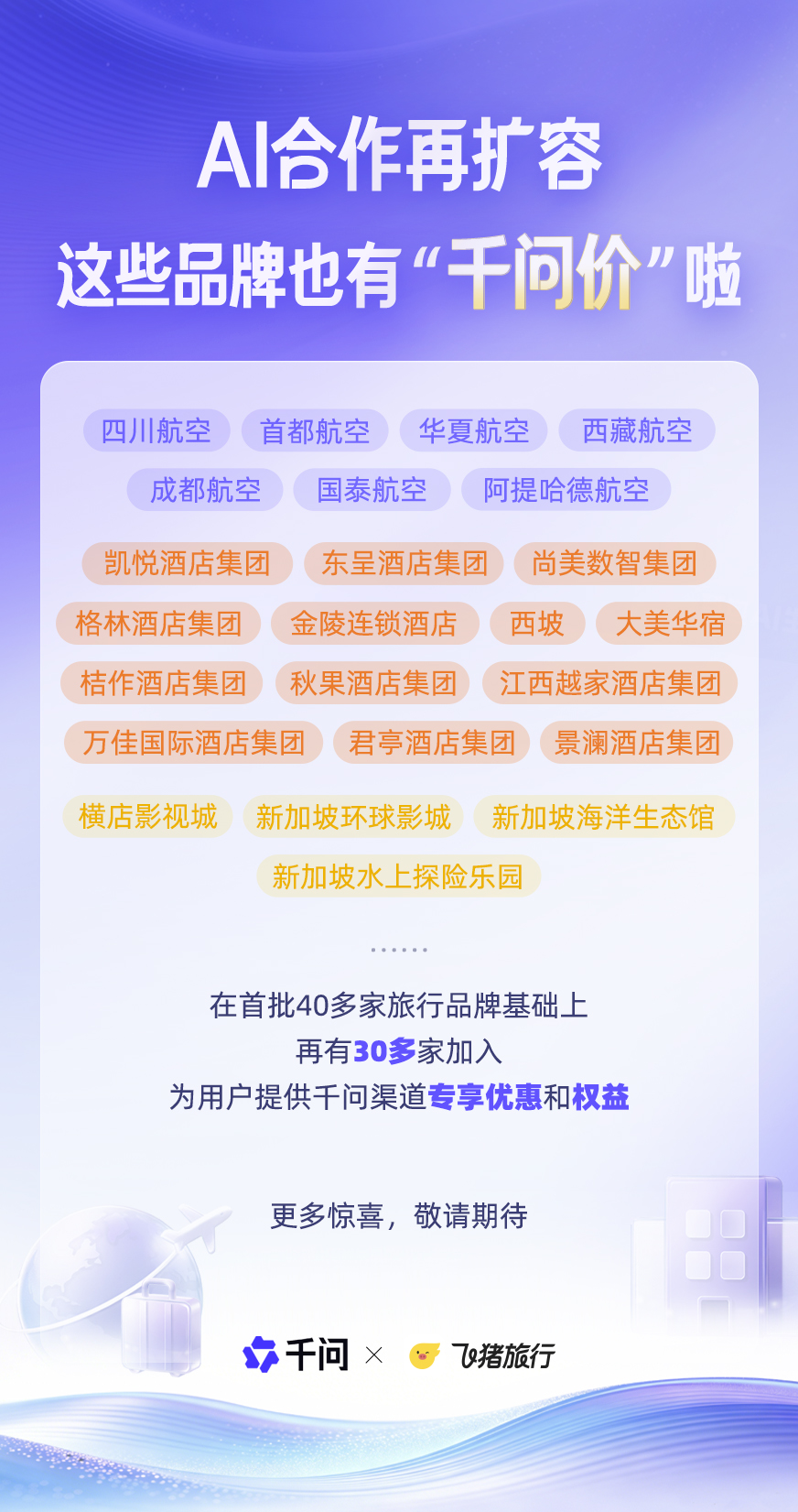 4月2日,飞猪与千问宣布再与30多家旅行品牌达成AI合作,截至目前已合作的国内外品牌数超80家。这些品牌将通过飞猪和千问APP的“AI办事”能力,为用户打造更智能、更专业的旅行服务,并提供千问专属补贴和权益。