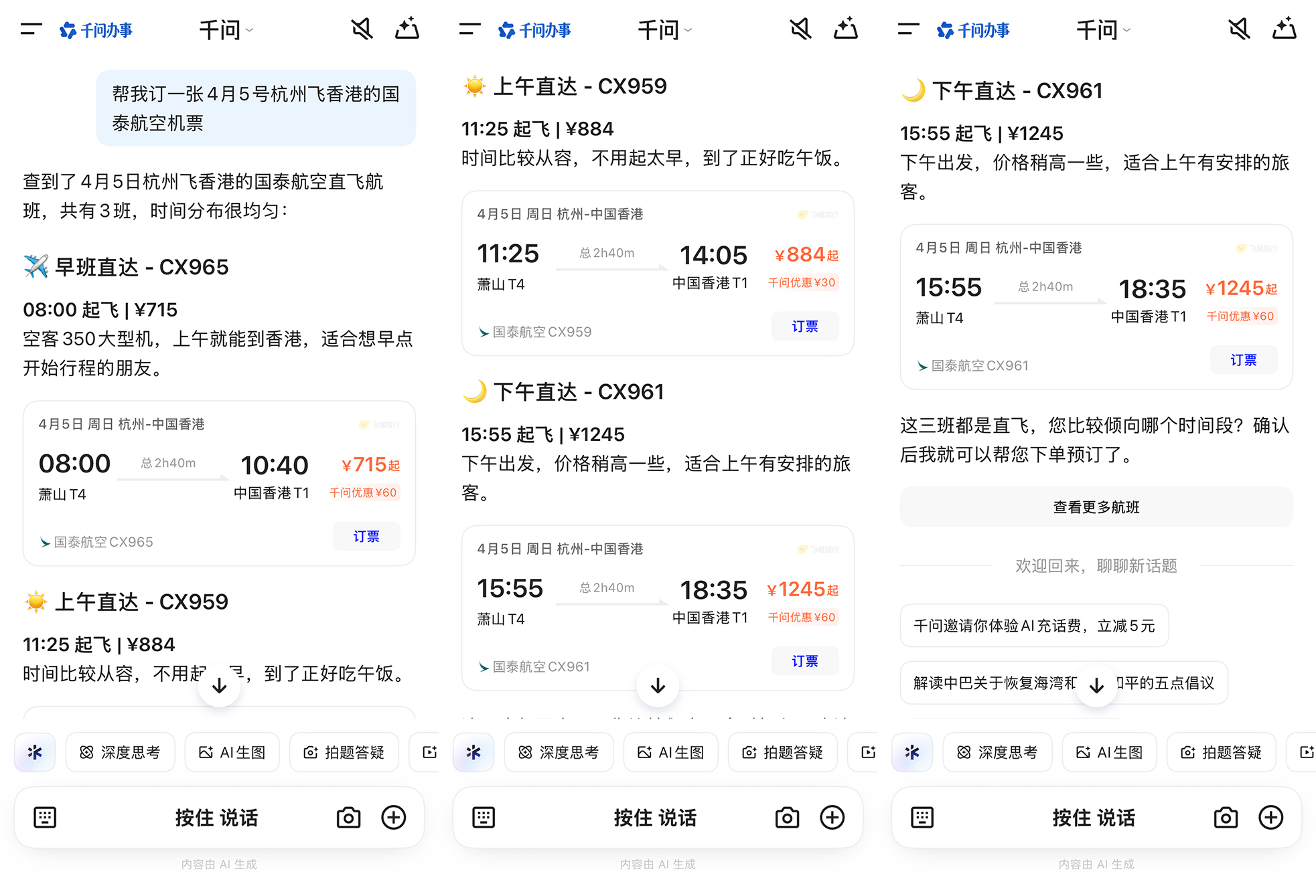 例如,用户对千问APP说“帮我订一张4月5日杭州飞香港的国泰航空机票”,它即刻理解用户意图并推荐了CX965、CX959、CX961三个不同时刻起飞的航班,3张机票均显示有“千问优惠”,立减金额30元到60元不等,点击具体航班卡片即可进入确认和支付环节。