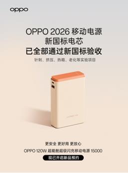 4月3日,强制性国家标准《移动电源安全技术规范》(以下简称新国标)正式发布,将于2027年4月1日实施。作为深度参与2026移动电源新国标的讨论与制定,以及新国标起草的核心企业,OPPO将“手机级”品质管控标准应用于移动电源产品线,打造 OPPO 冰盾安全电芯,宣布旗下待上市移动电源电芯全面通过新国标验收,并已开启新品预约。
