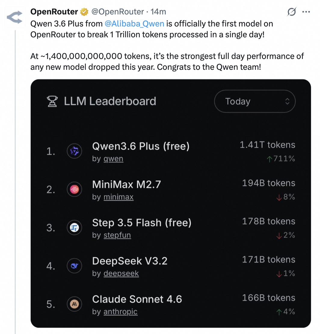 OpenRouter社媒官宣截图,称Qwen3.6-Plus破纪录,是“最强劲的新模型表现”