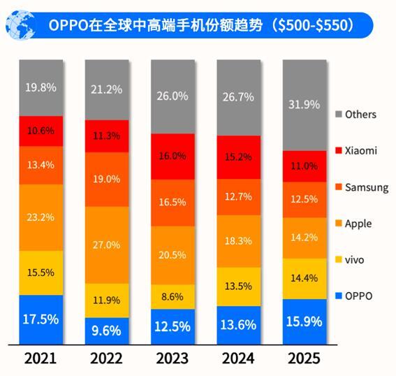 500–550 美元是全球智能手机市场公认的"高端入口"价格带,是所有手机厂商的必争之地。IDC 数据显示,2025 年 OPPO 在这一价格段的全球市场份额已稳居行业第一,成为该价格区间市场领导者。