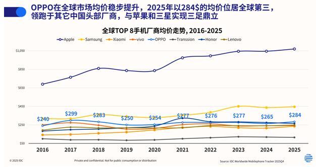 均价是衡量品牌高端化成色最直接的标尺。IDC 数据显示,2025 年 OPPO 全球智能手机均价达 284 美元,在全球出货量 TOP 8 厂商中仅次于苹果与三星,位列第三,同时以显著优势领跑所有其他中国头部手机品牌。