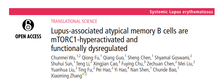 “狼疮相关非典型记忆B细胞内mTORC1通路高度活化且存在功能失调”研究成果发表在《风湿病年鉴》上