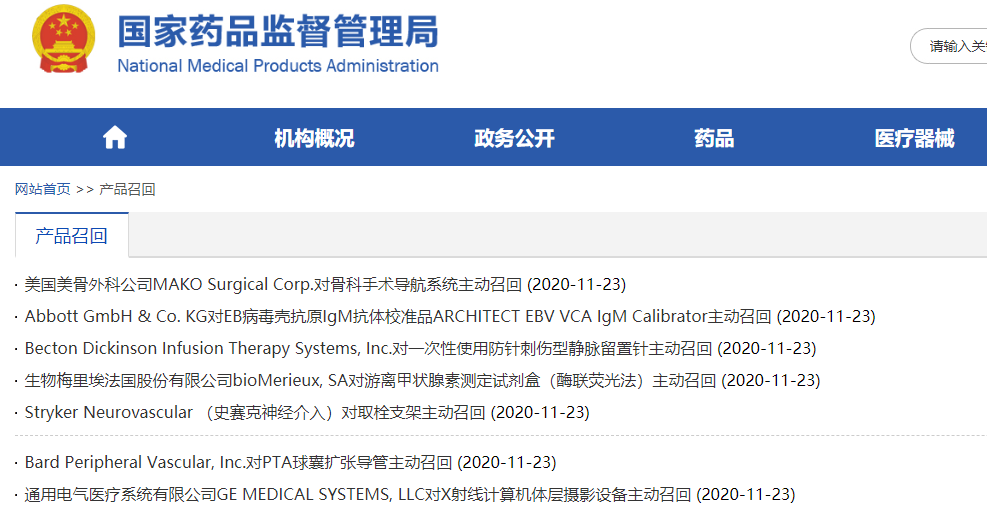 经济日报-中国经济网北京11月25日讯 11月23日,国家药监局公布了6家公司召回七款医疗器械产品的报告,涉及通用电气、雅培、碧迪医疗器械、梅里埃等公司。