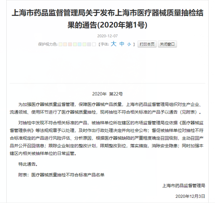 上海药监局表示,对抽检中发现不符合相关标准的产品,被抽样单位所在辖区的市场监督管理局应依据《医疗器械监督管理条例》等法规规章予以处理,及时作出行政处理决定并向社会公布;督促被抽样单位对抽检不符合标准规定的产品进行风险评估、分析原因,根据医疗器械缺陷的严重程度确定召回级别,主动召回产品并公开召回信息;跟踪企业制定的整改计划,限期整改到位,落实措施,消除安全隐患;同时加强本辖区内相关被抽样单位的日常监管。