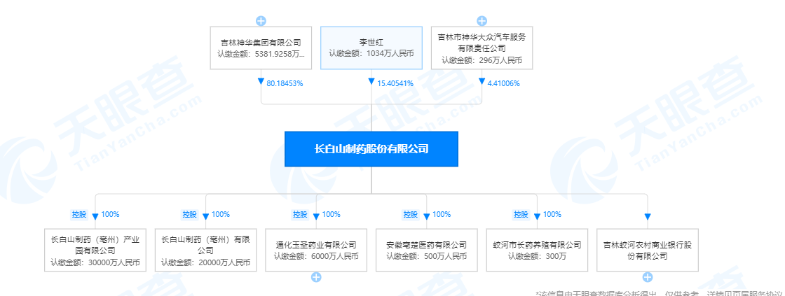 天眼查显示,长白山制药股份有限公司旗下有长白山制药(亳州)产业园有限公司、长白山制药(亳州)有限公司、蛟河市长药养殖有限公司、安徽亳楚医药有限公司、通化玉圣药业有限公司等6个子公司,母公司吉林神华集团有限公司持股80%,控股人李世红持股15%。