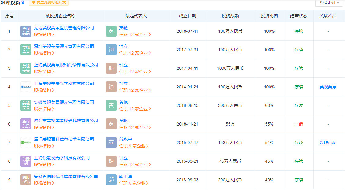 据了解,根植视光技术(上海)有限公司开设了上海美视美景眼科中心、深圳美视美景眼科·青少年近视防控中心等医疗服务机构,主要提供屈光矫正、验光/配镜等小儿眼科医疗服务,旗下有无锡美视美景医院管理有限公司、深圳美视美景视光管理有限公司、上海美视美景眼科门诊部有限公司、安徽省医眼视光健康管理有限公司等9家子公司。