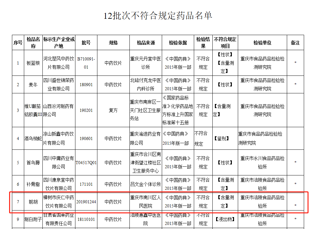 通告显示,经重庆市涪陵食品药品检验所检验,标示为樟树市庆仁中药饮片有限公司生产的前胡(批号201901244)不符合规定,不合格项目为含量测定。不过,树市庆仁中药饮片有限公司否认为其生产。