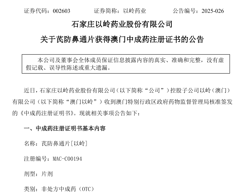 公告显示,芪防鼻通片是澳门药监局批准的第一个中成药创新药,用于治疗持续性变应性鼻炎。其功能主治为:益气固表,健脾通窍。用于持续性变应性鼻炎改善肺脾两虚证,症见喷嚏、流涕、鼻塞、鼻痒、自汗、恶风、神疲乏力、少气懒言、舌淡、苔白、脉浮或脉细弱。以岭药业拥有该药独立完整的知识产权。