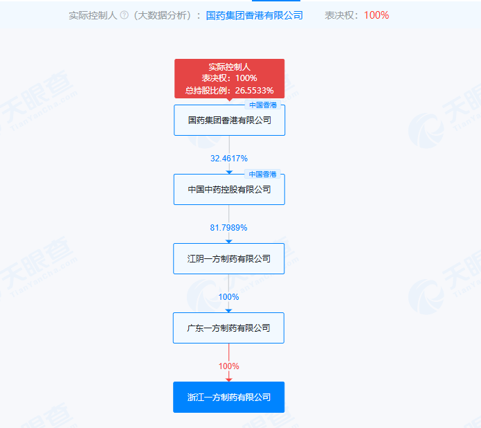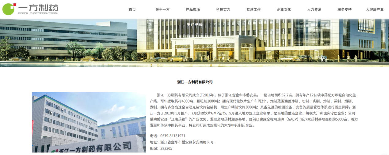 一方制药官网介绍,浙江一方制药有限公司成立于2016年,位于浙江省金华市磐安县,公司于2018年5月投产,7月获得饮片GMP证书,9月进入地方规上企业名单,是当地的重点企业、纳税大户和诚实守信企业。天眼查显示,国药集团香港有限公司为浙江一方制药有限公司实控人。
