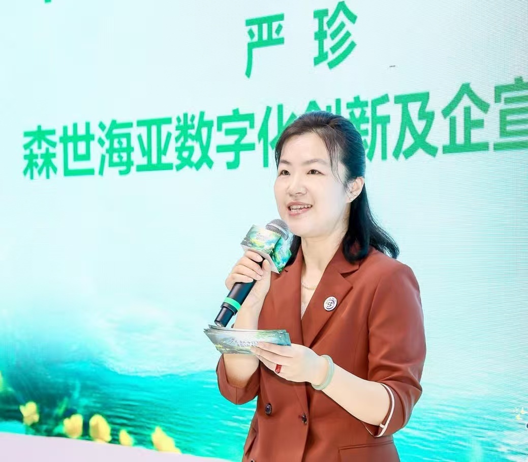 图为进博会上森世海亚数字化创新及企宣总监严珍在彩虹湾疗愈花园成果发布会致辞发言。