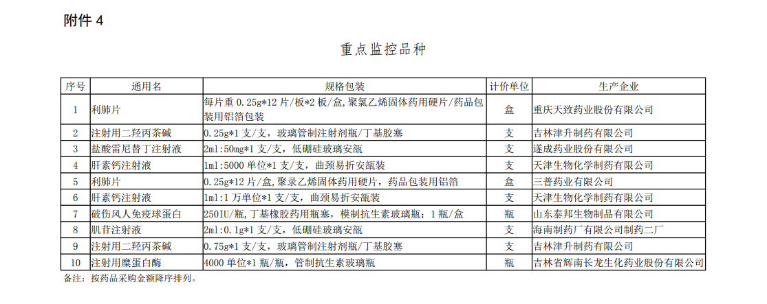 譬如,新申请超“黄线”品种名单中,北京同仁堂科技发展股份有限公司制药厂麻仁润肠软胶囊、云南白药集团股份有限公司云南白药气雾剂系独家品种;原在库超“黄线”品种名单中,浙江泰利森药业有限公司瑞格列奈二甲双胍片(II)是独家品种;未通过公允性品种名单中,湖北福人金身药业有限公司补心气口服液、上海玉丹药业有限公司参桂胶囊是独家品种;重点监控品种名单中,吉林津升制药有限公司注射用二羟丙茶碱为独家品种。