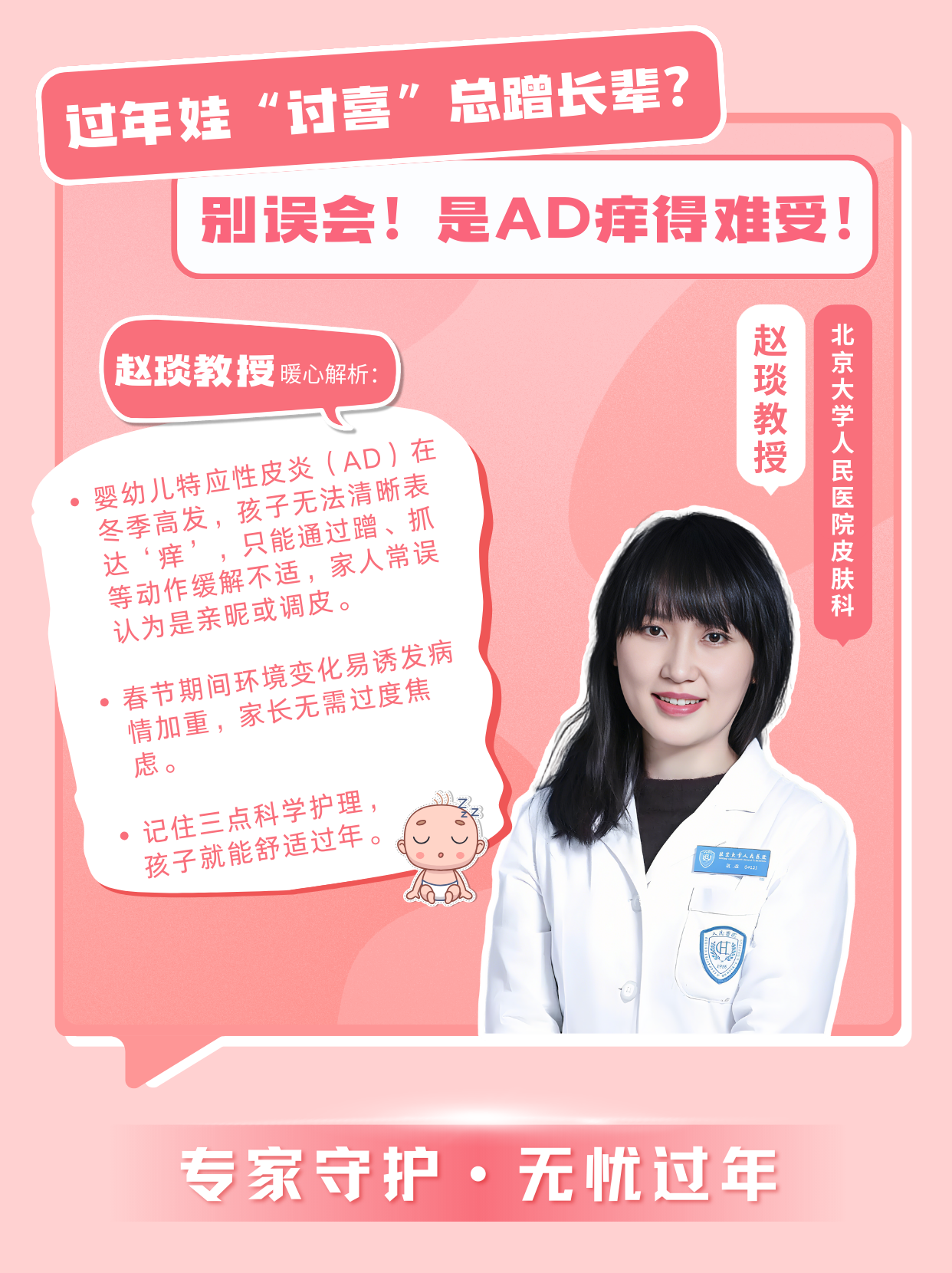 “婴幼儿特应性皮炎(AD)在冬季高发,孩子无法清晰表达‘痒’,只能通过蹭、抓等动作缓解不适,家人常误认为是亲昵或调皮。春节期间环境变化易诱发病情加重,家长无需过度焦虑,记住三点科学护理,孩子就能舒适过年: