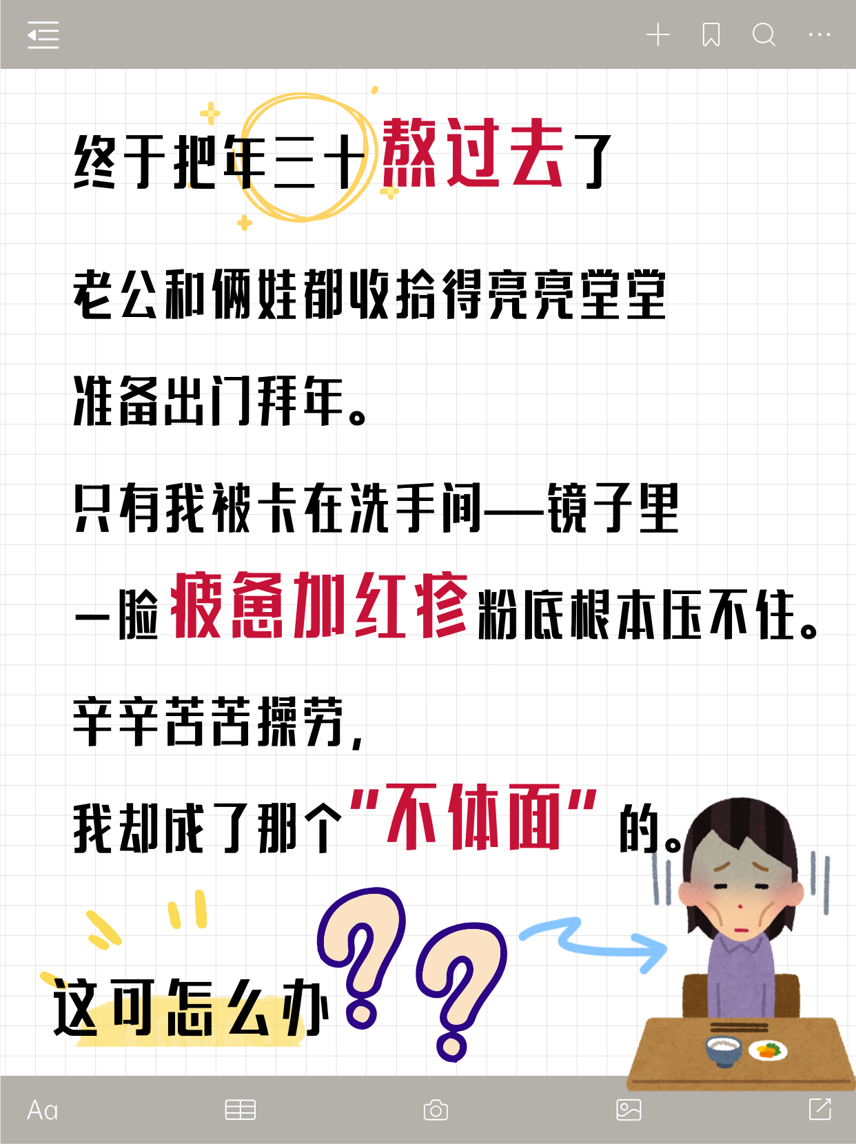 只有我被卡在洗手间——镜子里一脸疲惫加红疹,粉底根本压不住。