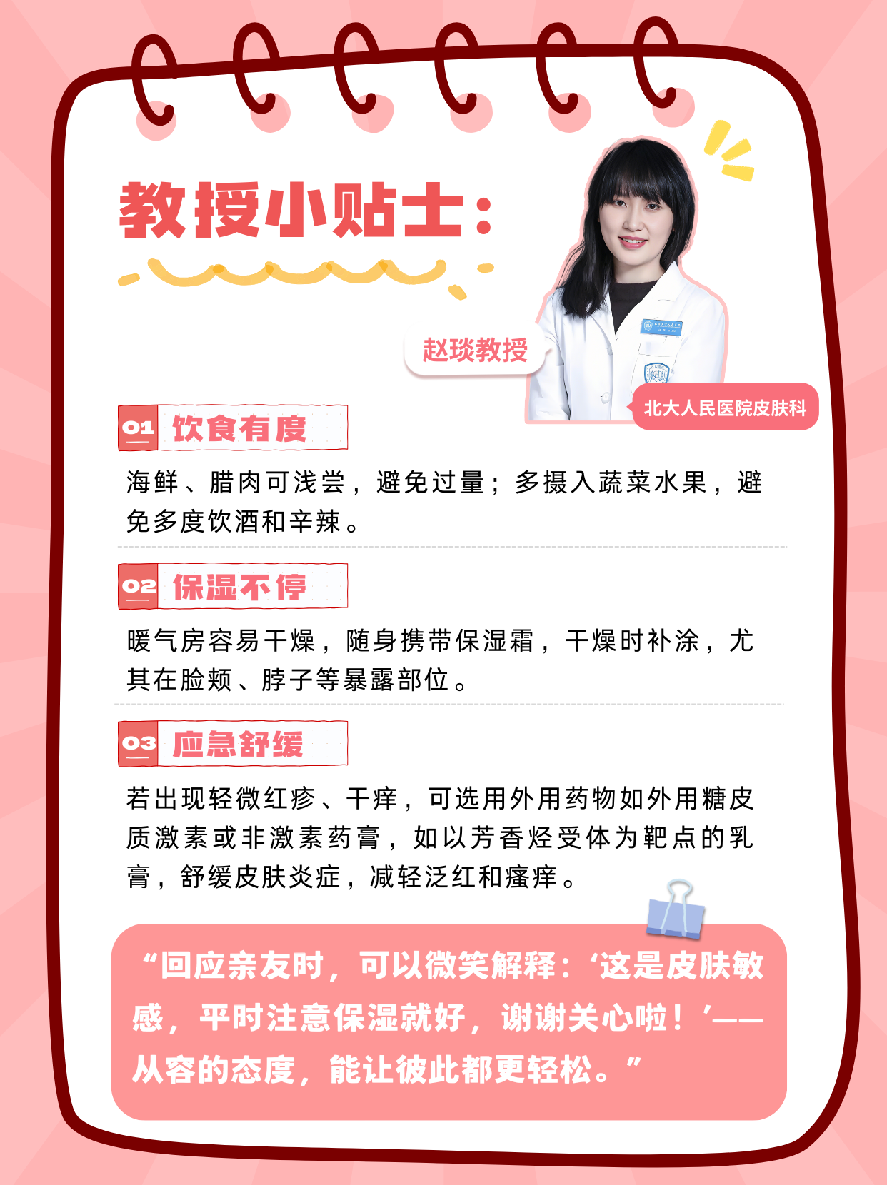 “回应亲友时,可以微笑解释:‘这是皮肤敏感,平时注意保湿就好,谢谢关心啦!’——从容的态度,能让彼此都更轻松。”