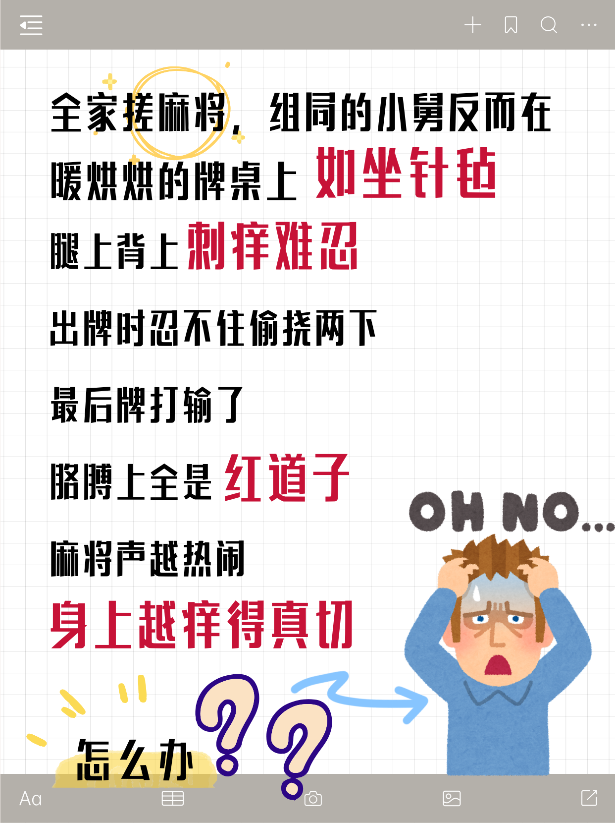 腿上背上刺痒难忍,出牌时忍不住偷挠两下,