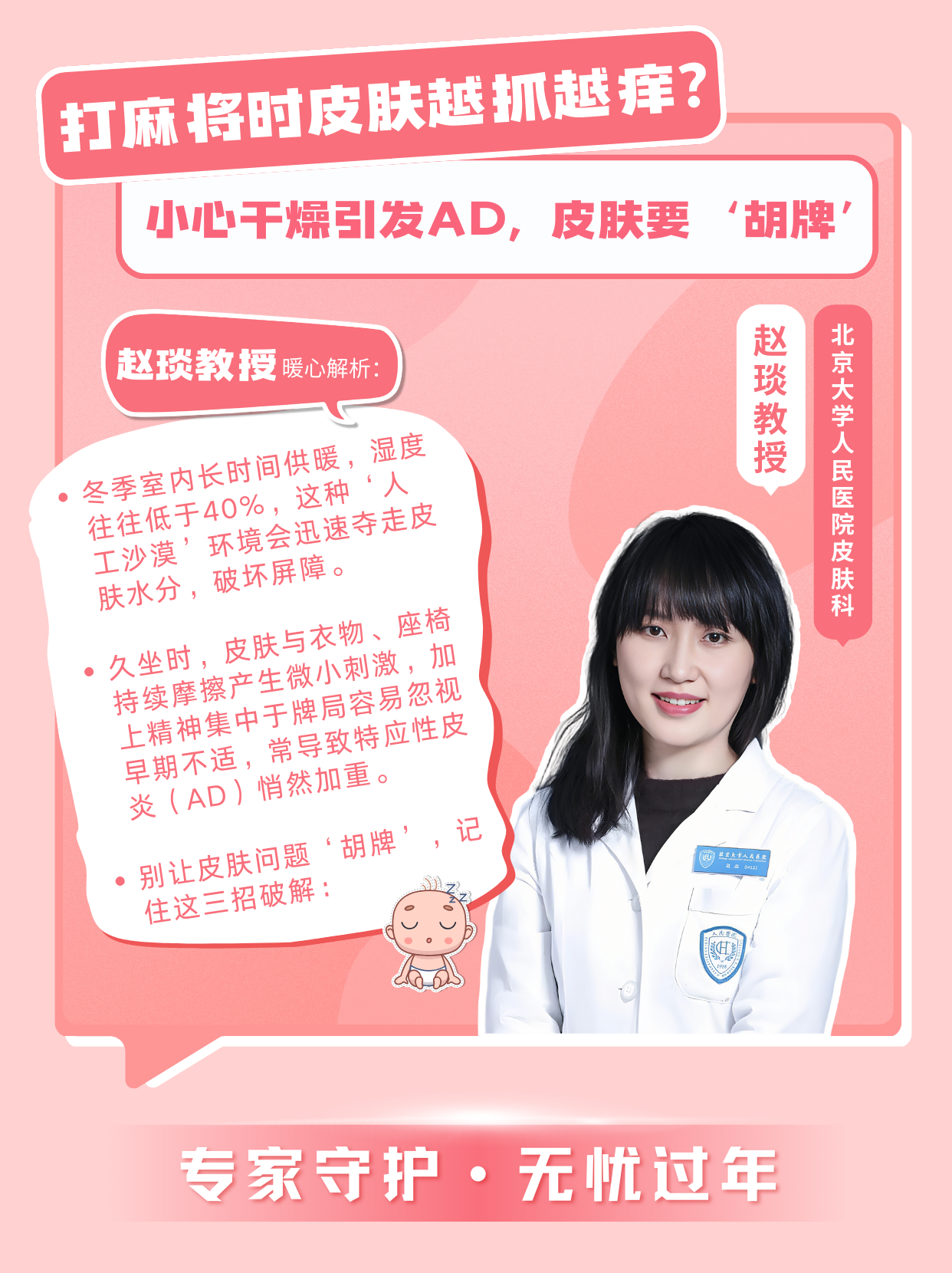 “冬季室内长时间供暖,湿度往往低于40%,这种‘人工沙漠’环境会迅速夺走皮肤水分,破坏屏障。久坐时,皮肤与衣物、座椅持续摩擦产生微小刺激,加上精神集中于牌局容易忽视早期不适,常导致特应性皮炎(AD)悄然加重。别让皮肤问题‘胡牌’,记住这三招破解: