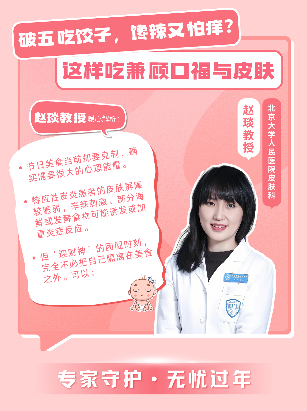 “亲友的误解恰恰是普及健康知识的好时机。‘特皮’(特应性皮炎,也称湿疹)不传染,它是一种与免疫、屏障功能相关的慢性皮肤炎症。过年聚餐,不用过度紧张,记住三点: