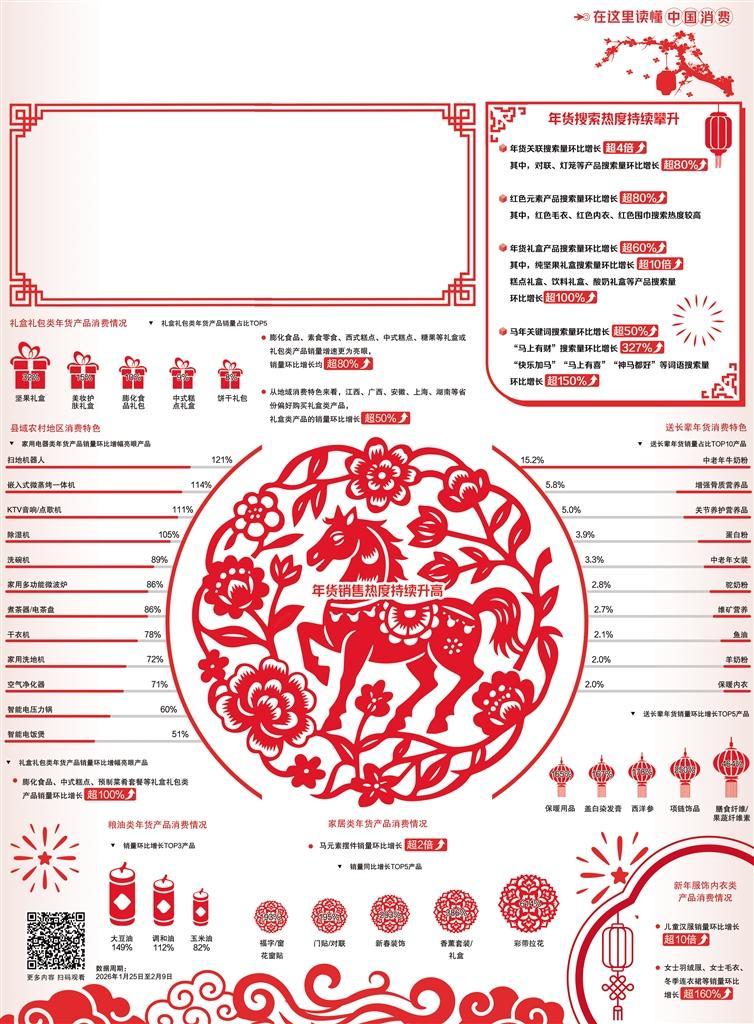 当前,年货消费呈现出“新旧融合、多元拓展”的显著特征。一方面,承载吉祥寓意的“好彩头年货”持续走热。其中,红色元素全面渗透年货消费场景,在最受消费者喜爱的红元素年货品类中,窗花、福字、灯笼、中国结等传统装饰产品持续热销,成为打造家庭年味氛围的首选。同时,“马年”关键词搜索量环比大幅增长,生肖酒、对联、玩偶、抱枕等产品的搜索量环比增幅均超过80%。各类搭配马年吉祥祝福的产品热销,在“龙马精神”“马上有福”“一马当先”等祝福语加持下,不少马年礼盒类产品受到消费者欢迎。