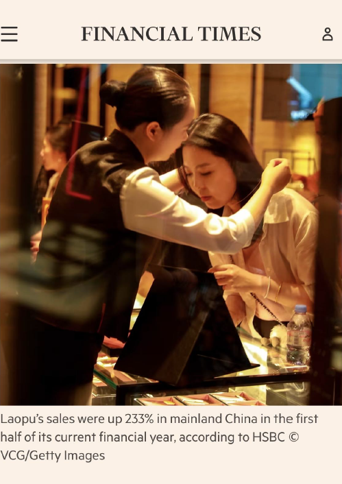 近日,英国金融时报发布文章,指出在西方奢侈品牌面临挑战之际,中国本土品牌正悄然崛起,黄金珠宝品牌老铺黄金尤为引人注目,它被视为首个成功营造出奢侈品价值感的中国黄金珠宝品牌。