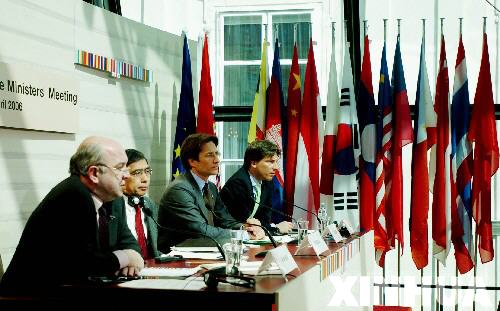 4月9日,在奥地利首都维也纳,奥地利财政部长格拉塞尔(右二)主持第七届亚欧财长会议的闭幕新闻发布会。新华社记者吴晓凌摄
