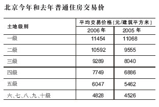 据市建委公布,今年不同级别土地上的普通住房平均交易价格标准均比去年有所上升,其中二、三级土地的普通住房交易价格标准都上涨了千元以上。2006年不同级别土地上的普通住房平均交易价格标准,依据北京市房地产交易管理网去年新建普通商品住房预售登记备案数据确定。