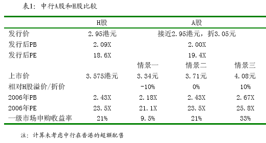 情景三:考虑国有银行在A股具有稀缺性,上市规模不大,且目前大部分A股相对H股有溢价,假设A股溢价10%,一级市场申购收益率约30%。