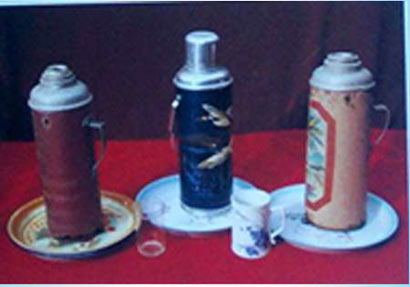 毛泽东用过的暖水瓶。左右两个是在中南海丰泽园故居用的,中间的是搬到游泳场以后用的。